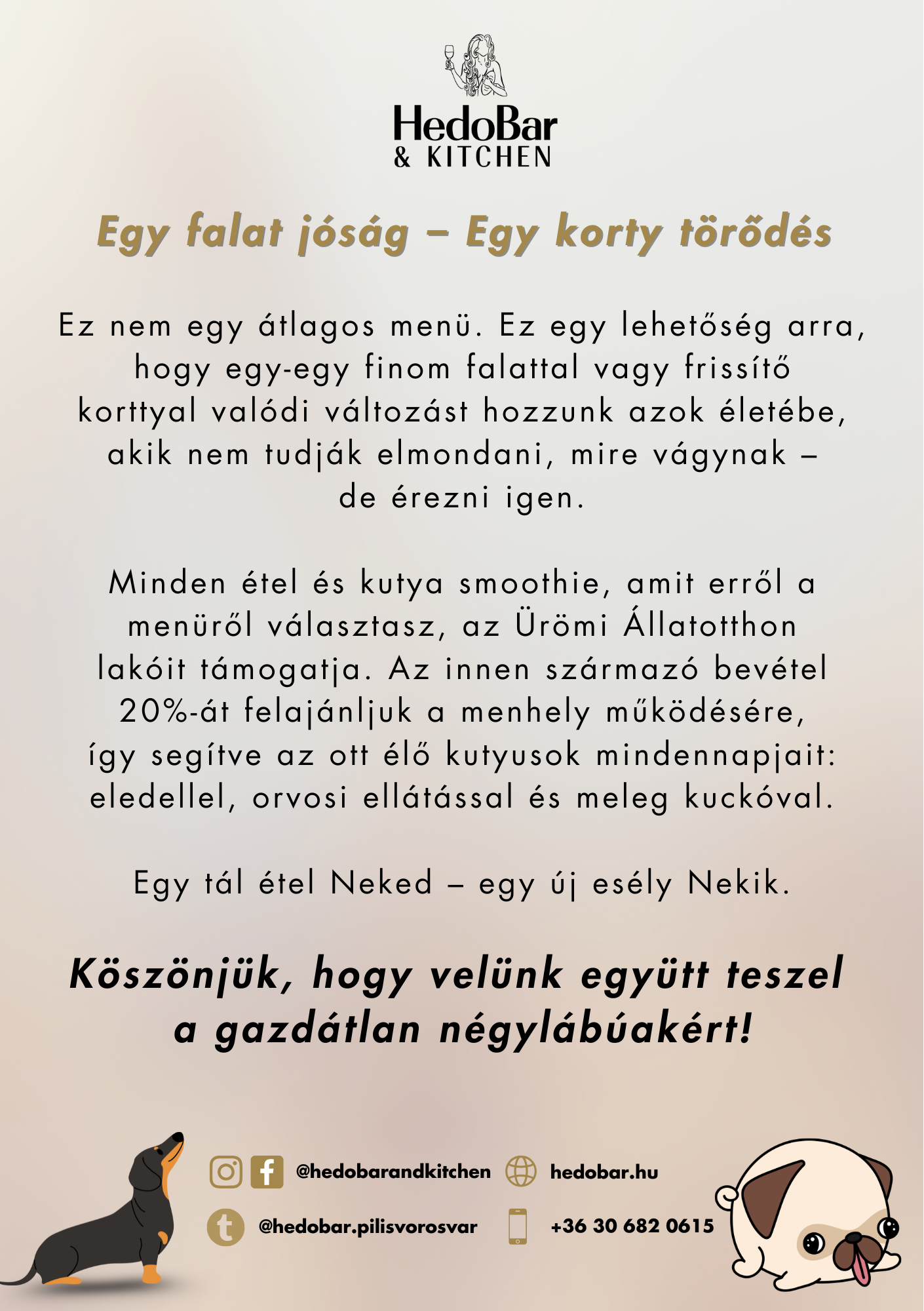 Légy részese egy jó ügynek, miközben élvezed a HedoBar élményt! Támogasd az Ürömi Állatotthon kutyáit egy különleges menüvel a HedoBar & Kitchen étteremben! Minden rendeléssel jótékony célt szolgálsz – egy falat Neked, egy új esély Nekik.